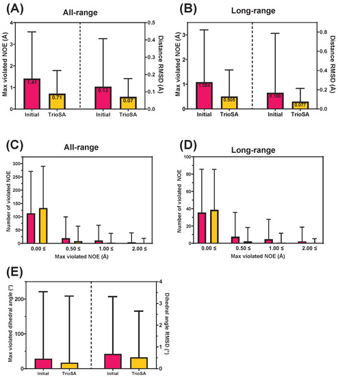 Comparison of initial and refined NMR protein structures using TrioSA. (A,B) Maximum violated NOE and distance RMSD for all-range and long-range distance NOE restraints, respectively. (C,D) The number of violated NOE restraints in the initial and refined structures, with maximum violated NOE cutoffs of 0.00 Å, 0.50 Å, 1.00 Å, and 2.00 Å for all-range and long-range distance NOE restraints. The magenta color represents the initial NMR structure, while the yellow color represents the TrioSA refined structure. (E) Maximum violated dihedral angle and dihedral angle RMSD histograms with standard deviation bars.