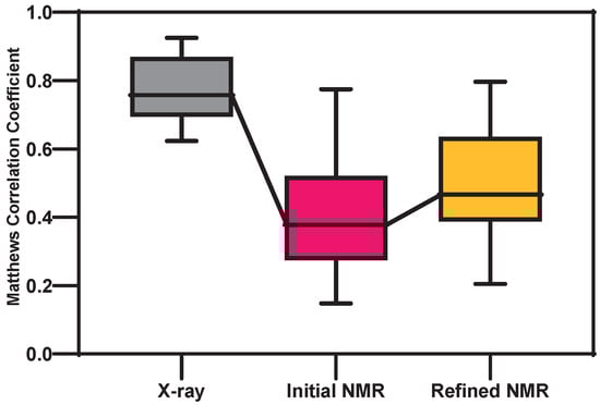 The box-and-whisker plot shows the Matthews correlation coefficient (MCC) of protein–ligand residues for the X-ray, initial, and refined NMR structures. The boxes represent the upper and lower quartiles, with the median indicated by a horizontal line within the box. The whiskers indicate the range of data, with the minimum and maximum values shown as individual points.