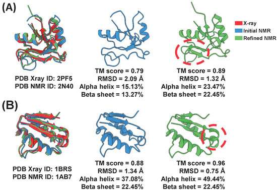 Comparison of X-ray and NMR structures in (A) X-ray ID 2PF5, NMR ID: 2N40; and (B) X-ray ID: 1BRS, NMR ID: 1AB7. The refined NMR structures (2N40 and 1AB7) displayed enhanced structural quality, as indicated by increased TM score, decreased RMSD, and increased secondary structure content compared to the original NMR structures.