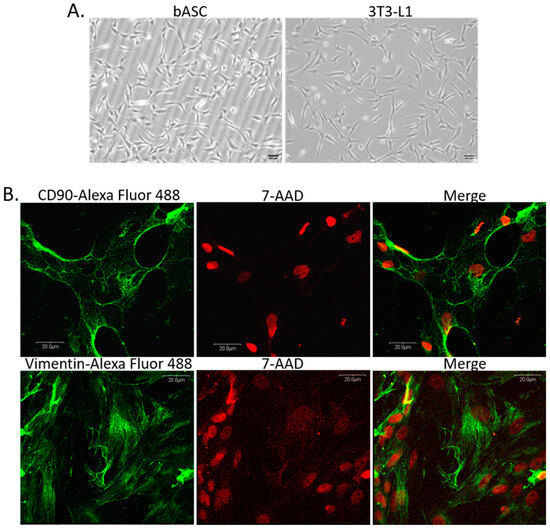 (A) Morphology of monolayer cultures of bovine adipose-derived stem cells (bASC)—passage 3, and 3T3-L1 murine preadipocyte cell line used as a reference cell line for adipogenic differentiation. Phase-contrast micrographs were taken at 100× magnification, scale bars represent 200 µm. (B) Panels of confocal micrographs presenting immunofluorescence staining of bASC with antibodies against CD90 (upper panel) and vimentin (lower panel). Secondary antibodies were conjugated with Alexa Fluor 488 dye (green fluorescence), nuclei were counterstained with 7-AAD (red fluorescence). Images were taken at 600× magnification and are representative for three independent experiments.