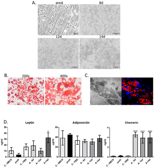 Adipogenic differentiation of bASC. (A) Morphology of monolayer cultures of undifferentiated bASC described as preadipocytes (preA) and bASC subjected to in vitro adipogenic differentiation (as described in the text) for 8, 12, or 14 days. Phase-contrast micrographs were taken at 200× magnification. Scale bar in image presenting preadipocytes represents 200 µm, whereas in images presenting adipocytes on days 8, 12 and 14 of differentiation the scale bars represent 50 µm (B) Phase-contrast images of bovine adipocytes on day 12 of differentiation stained with Oil Red O to detect neutral lipids—images were taken at 200× and 400× magnification. Scale bars represent 200 µm (C) A representative confocal image of LipidTOXTM-stained lipid vacuoles (red fluorescence) in bovine adipocytes on day 12 of bASC differentiation (right micrograph) with nuclei counterstained with Hoechst 33342 (blue fluorescence); left micrograph presents the same cells in Nomarski interference contrast. Images were taken at 600× magnification and are representative for three independent experiments. Scale bars represent 20 µm (D) Concentration of selected adipokines: leptin, adiponectin, chemerin in conditioned media (CM) derived from 24 h culture of bovine preadipocytes (preA) and adipocytes on different days of differentiation (8 d, 12 d, 14 d). Fresh culture media supplemented with 10% NBCS or 10% FBS were used as controls, to exclude the levels of adipokines in sera present in the media. Results are presented as means ± standard deviation of three separate experiments. Values that differed significantly from both types of control media are marked as * (p < 0.05), **** (p < 0.0001).
