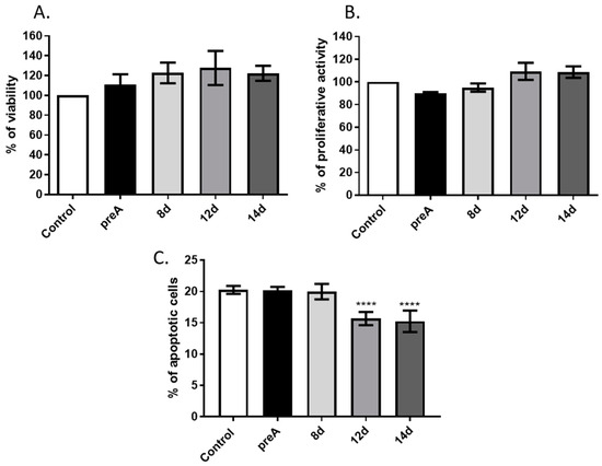 Stromal cells of the mammary gland actively participate in regulation of the mammary epithelium development via synthesis and secretion of active biomolecules (e.g., hormones, growth factors, chemokines), as well as through direct cell–cell interactions. In the present study, we investigated the effect of paracrine actions of undifferentiated preadipocytes as well as adipocytes on bMEC growth and viability. In the first step, we analyzed the influence of conditioned media collected from preadipocytes (preA) and adipocytes at different stages of differentiation (8 d, 12 d, 14 d) on viability, proliferative activity, and apoptotic cell death of bMEC. Results of MTT assay did not show any significant differences in viability of bMEC grown in standard growth medium or in CM collected from preadipocytes (preA) and adipocytes (8 d, 12 d, 14 d) (Figure 4A). To test the proliferative activity of bMEC, the CyQUANT® Proliferation Assay was used, which is based on the measurement of cellular DNA content using a dye exhibiting fluorescence when bound to DNA. Proliferative activity of bMEC did not change significantly after treatment with the experimental conditioned media in comparison to control (Figure 4B). Annexin V assay was used to determine the percentage of apoptotic cells in cultured bMEC population (Figure 4C). The results showed significantly decreased number of apoptotic cells (Annexin Vpos/PIpos) when bMEC were cultured in CM collected from mature adipocytes (12 d and 14 d), indicating an anti-apoptotic effect of paracrine factors synthetized by adipocytes (Figure 4C).