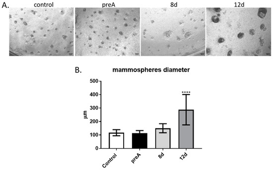 Effect of paracrine actions of bovine preadipocytes (preA) and adipocytes on different days of differentiation (8 d, 12 d) on bMEC’s ability to form mammospheres when cultured on Matrigel. (A) bMEC cultured for 6d on inserts coated with Matrigel, grown above wells in which bASCs were cultured at different stages of adipogenic differentiation: prior differentiation (preA), on day 8 or day 12 of differentiation (8 d, 12 d, respectively). Control cells were grown in standard growth medium for bMEC. Images are representative for three separate experiments (40× magnification was used). Scale bars represent 500 µm. (B) Diameters of mammospheres formed by bMEC cultured for 6 days on inserts coated with Matrigel, grown above wells with cultured bovine preadipocytes or adipocytes at different stages of differentiation. Results are presented as means ± standard deviation of three separate experiments, in which diameters of at least 10 mammospheres per each experimental condition were measured. Values that differed significantly from control are marked as **** (p < 0.0001).