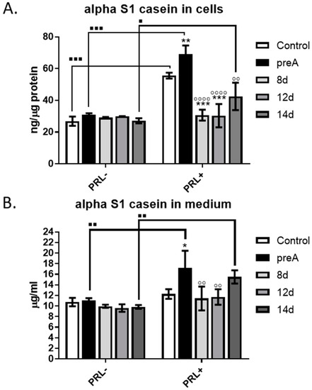 Effect of conditioned media (CM) derived from 24 h culture of bovine preadipocytes (preA) and adipocytes on different days of differentiation (8 d, 12 d, 14 d) on synthesis and secretion of alpha S1-casein by bMEC. Graphs present concentration of alpha S1-casein in: (A) cells after 24 h of treatment; (B) culture medium collected after 24 h of treatment. In this experiment, prolactin (PRL, 3 µg/mL) was used as an additional prolactogenic factor. Results are presented as means ± standard deviation of three independent experiments. Values that differed significantly within one type of treatment (PRL− or PRL+) in comparison to control are marked as * (p < 0.05), ** (p < 0.01), or *** (p < 0.001). Values that differed significantly from preA in cells treated with prolactin (PRL+) are marked as ◦◦ (p < 0.01), or ◦◦◦◦ (p < 0.0001). Values that differed significantly between two types of treatments (PRL− and PRL+) are marked as ∎ (p < 0.05), ∎∎ (p < 0.01), or ∎∎∎ (p < 0.001).