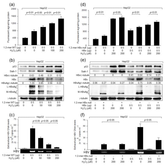 The detailed mechanism by which H2O2 inhibits HBV replication in a p53-dependent fashion was investigated. According to data obtained with an in vitro HBV infection system, H2O2 dose-dependently lowered the levels of HBx, a positive regulator of HBV replication [,,,,], in HepG2-NTCP cells but not in Hep3B-NTCP cells (Figure 1a,e). In addition, ectopic p53 expression enabled H2O2 to downregulate HBx levels in Hep3B-NTCP cells (Figure 1i). These results suggest that HBx mediates the potential of H2O2 to inhibit HBV replication in a p53-dependent mechanism. To prove that H2O2 inhibits HBV replication by lowering HBx levels, a 1.2-mer WT HBV replicon (1.2-mer WT) and its HBx-null counterpart (1.2-mer HBx-null) [] were employed. Transient transfection of HepG2 cells with 1.2-mer WT resulted in the generation of ROS (Figure 3a), upregulation of p53 levels (Figure 3b), production of intracellular HBV proteins, including HBx and HBsAg (Figure 3b), and secretion of extracellular virus particles (Figure 3c). Consistent with data obtained with an in vitro HBV infection system (Figure 1a,c), H2O2 treatment further elevated intracellular ROS and p53 levels in HepG2 cells transfected with 1.2-mer WT in a dose-dependent fashion (Figure 3a,b). In addition, H2O2 treatment inhibited replication of HBV derived from 1.2-mer WT in HepG2 cells, as evidenced by the lowered levels of intracellular HBV proteins and extracellular virus particles (Figure 3b,c). These results indicate that the negative regulation of HBV replication by H2O2 can be exactly reproduced in a 1.2-mer HBV replicon system.