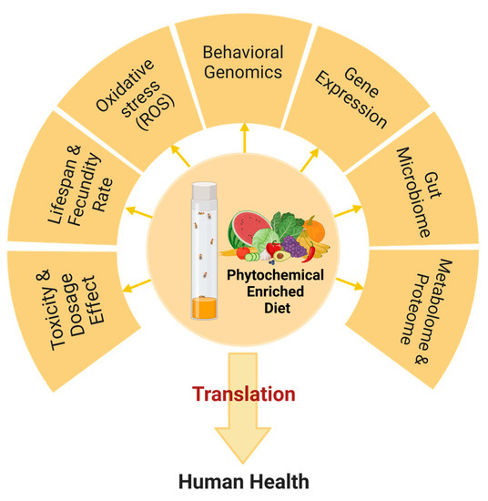 The significant genetic and physiological differences between Drosophila and humans and the additional layers of regulation and organ systems in humans hinder the direct translation of phytochemical consumption observed responses in flies. Likewise, metabolic and pharmacokinetic variations between Drosophila and humans can lead to differences in exposure levels and bioavailability of phytochemicals, affecting the observed effects and limiting the translation of dosage and treatment regimens. Moreover, the complex nature of human diseases, involving multiple factors, makes it challenging for Drosophila models to fully capture disease mechanisms and reflect the intricacy of human diseases. To overcome these limitations, it is essential to integrate findings from multiple model systems, starting from the Drosophila model, including in vitro studies in rats and human clinical trials. This comprehensive approach will help bridge the gap between Drosophila research and translational applications in human health, providing more reliable evidence regarding the potential benefits and risks associated with phytochemical use in humans.