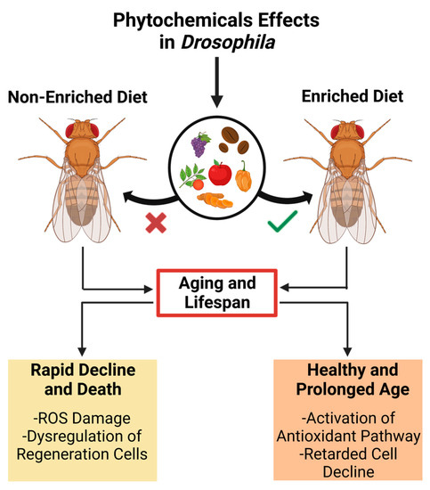 Age-related dysregulation of development is closely associated with functional organ and tissue decline, affecting lifespan and age-related disease development [60]. A modern lifestyle characterized by high caloric intake and minimal physical activity in humans results in high lipid storage levels that reduce overall lifespan [68]. Nevertheless, several studies have shown that several phytochemicals can expand the lifespan using Drosophila as a model (Figure 2) [69].