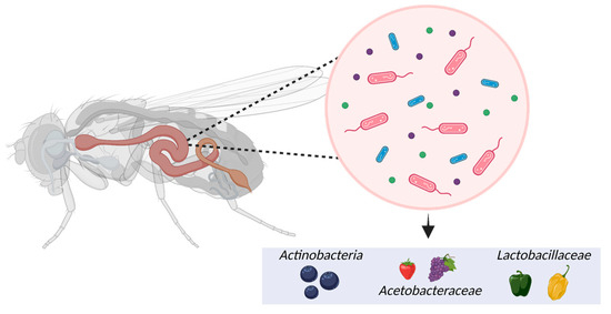 The Drosophila gut microbiome is extracellular and encompasses three regions: the foregut, midgut, and hindgut, each creating distinct conditions for microbial cells [97]. Although the Drosophila gut microbiome has been well-documented, it is important to note that fruit flies have a limited number of microorganisms, about 30 species, compared to mammals with more than 500 species [98]. The gut microbial population is profoundly influenced by the dietary habits associated with consuming different types and amounts of phytochemicals (99). It also varies depending on the host genotype, age, sex, and habitat [99,100]. Garcia-Lozano et al. [101] conducted a study using three different Drosophila genotypes (Berlin-K, Oregon-RC, and Canton-s) and three distinct diets supplemented with bell, serrano, and habanero peppers, respectively. The results showed that pepper-containing diets appeared to enhance members of Lactobacillaceae and Acetobacteraceae in the Drosophila gut microbiome (Figure 3). Among them, L. brevis belonging to the Lactobacillaceae family was 4-fold higher in flies reared on pepper-containing diets than in the guts of flies raised on the control diet. L. brevis is traditionally consumed for its prophylactic and therapeutic benefits against various diseases, such as human inflammatory bowel syndrome [102].