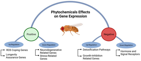 Phytochemical intake can modulate gene expression, influenced by factors, such as cell type, life stage, and growing conditions. Different mechanisms of gene regulation, including cis-regulatory elements, repressor proteins, non-coding RNA, and epigenetic processes, such as methylation, may be affected by phytochemicals [93,118,119,120]. High-throughput technologies, such as RNA-seq, are commonly used to study gene regulation and metabolic pathways on a genome-wide scale [120,121]. Phytochemicals have the potential to modulate metabolic pathways and coping mechanisms that counteract age-related neurodegenerative diseases [122]. Although phytochemicals can positively influence the health of D. melanogaster by upregulating genes associated with longer lifespans and down-regulating genes related to diseases and stress, they can also have negative effects by upregulating genes associated with reduced growth rates. Additionally, they may trigger mechanisms related to detoxification and reduce the expression of genes involved in coping with reactive oxygen species (ROS) and hormone-signaling receptors (Figure 4).
