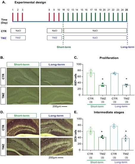 2.3. Temozolomide Induced Short- and Long-Term Effects on Cell Proliferation and Intermediate Stages of Hippocampal Neurogenesis