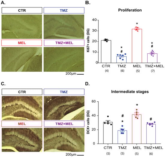 3.2. Melatonin Prevents the Decrement of Ki67 and Doublecortin Cells in the Granular Cell Layer and the CNPase Immunoreactivity in the Dentate Gyrus’s Hilus Caused by Temozolomide