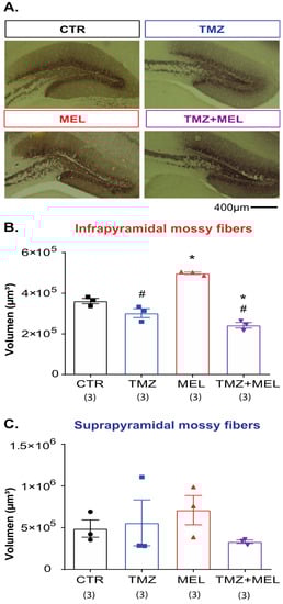 2.5. Melatonin Increased the Volume of the Infrapyramidal Mossy Fibers Tract in the Hilus of the Dentate Gyrus