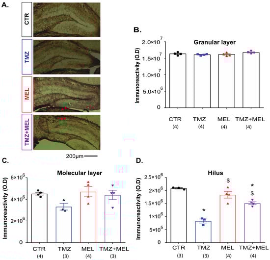 2.6. Temozolomide Decreased CNPase Immunoreactivity in the Hilus but Not in the Granular Cell or the Dentate Gyrus’s Molecular Layer