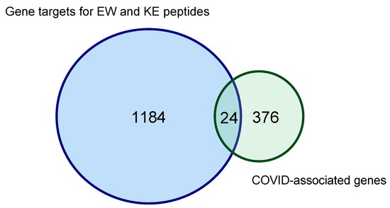 Euler diagram showing the ratio of human genes potentially under the control of short peptides and genes associated with the development of COVID-19 according to search results in the EPD database. The intersection of the circles indicates the number of genes associated with the development of COVID-19, which are potential targets for KE and EW peptides.