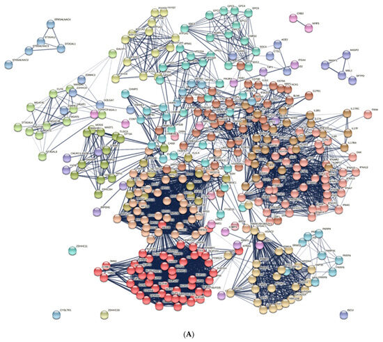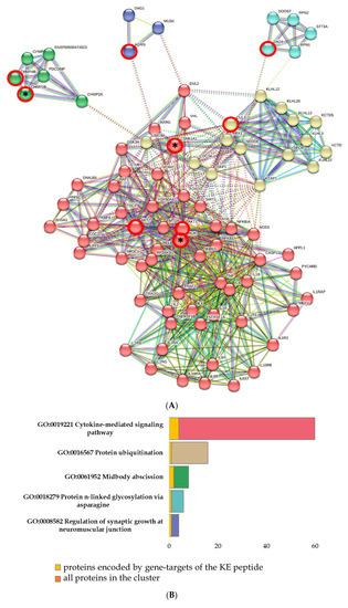 When analyzing the network of protein–protein interactions formed by the saturation of the set of proteins encoded by the COVID-associated KE peptide target genes and cytokine storm proteins, five clusters were identified according to GO terms. In these clusters, proteins have been associated with various biological processes, such as cytokine-mediated signaling pathways (AKT1, AKT2, APPL1, AXIN1, CASP1, CHUK, CSNK1A1, FOXO3, HSP90AA1, IKBKG, IL10, IL10RA, IL10RB, IL1B, IL1R1, IL1R2, IL1RAP, IL2, IL2RA, IL2RB, IL2RG, IL4, IL4R, IL6, IL6R, IL6ST, MDM2, MTOR, NFKB1, NFKB2, NFKBIA, NOS3, PHLPP1, RELB, TNF, TNFRSF1A, TNFRSF1B, TRADD, TRAF2), protein ubiquitination (CUL3, KCTD10, KCTD5, KEAP1, KLHL12, KLHL13, KLHL20, KLHL22, KLHL3, NEDD8, RBX1, SPOP), midbody abscission (CHMP2A, CHMP2B, CHMP3, CHMP4B, ENSP00000474823, PDCD6IP), protein n-linked glycosylation via asparagine (DAD1, DDOST, RPN1, RPN2, STT3A), and the regulation of synaptic growth at neuromuscular junctions (AGRN, DAG1, MUSK) (Figure 4).