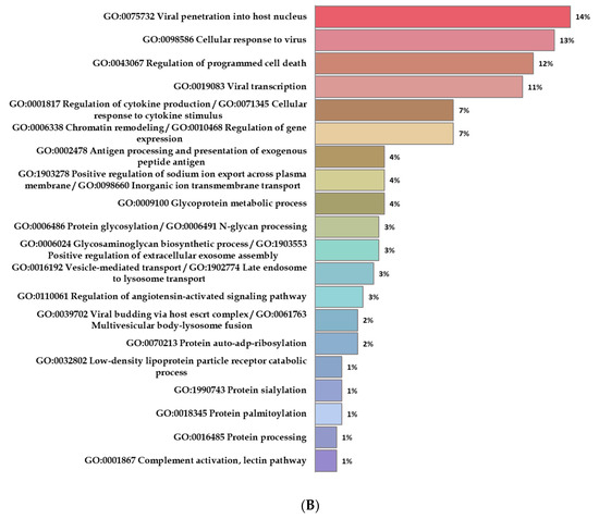 The set of proteins encoded by COVID-19-associated genes according to the PathCards database. (A) represents the network of protein–protein interactions, and (B) represents the proportion of proteins in biological processes according to GO terms.