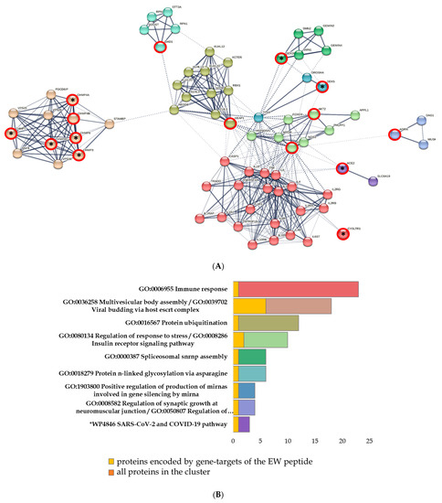 When analyzing the network of protein–protein interactions formed by the saturation of the set of proteins encoded by the COVID-associated EW peptide target genes and cytokine storm proteins, nine clusters were identified according to GO terms. In these clusters, proteins have been associated with various biological processes, such as immune response (CASP1, CYSLTR1, IL10, IL10RA, IL10RB, IL1B, IL1R1, IL1R2, IL1RAP, IL2, IL2RA, IL2RB, IL2RG, IL4, IL4R, IL6, IL6R, IL6ST, TNF, TNFRSF1A, TNFRSF1B, TRADD), multivesicular body assembly/viral budding via host ESCRT complex (CHMP3, CHMP4A, CHMP4B, CHMP4C, CHMP6, CHMP7, PDCD6IP, SNF8, STAMBP, VPS25, VPS28, VPS36), protein ubiquitination (CUL3, KCTD5, KEAP1, KLHL12, KLHL13, KLHL20, KLHL22, KLHL3, NEDD8, RBX1, SPOP), regulation of immune system and apoptotic processes (AKT1, AKT2, APPL1, FOXO3, HSP90AA1, MTOR, NOS3, PHLPP1), spliceosomal SNRNP assembly (DDX20, GEMIN2, GEMIN4, SMN1, SMN2), protein n-linked glycosylation via asparagine (DAD1, DDOST, RPN1, RPN2, STT3A), positive regulation of the production of miRNAs (DDX5, DROSHA, TP53), regulation of synaptic growth at the neuromuscular junction (AGRN, DAG1, MUSK), and the WP4846 SARS-CoV-2 and COVID-19 pathway (ACE2, SLC6A19) (Figure 3).