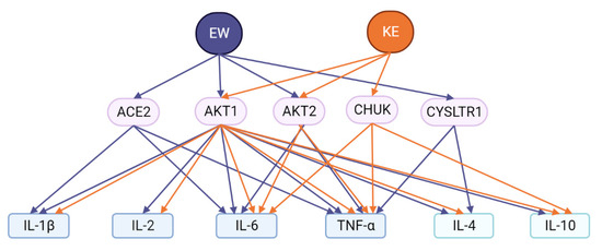 Thus, out of all 14 proteins encoded by the target genes of the EW and KE peptides, AKT1 and AKT2 proteins are common for both said peptides as potential intermediates in the peptide regulation of the cytokine storm. At the same time, ACE2 and CYSLTR1 proteins are specific for the EW peptide and are functionally associated with IL-1β, IL-6, TNF-α, and IL-4 cytokines. The CHUK protein is an intermediate functional element for the KE peptide and is associated with the IL-6, TNF-α, and IL-10 cytokines (Figure 5).