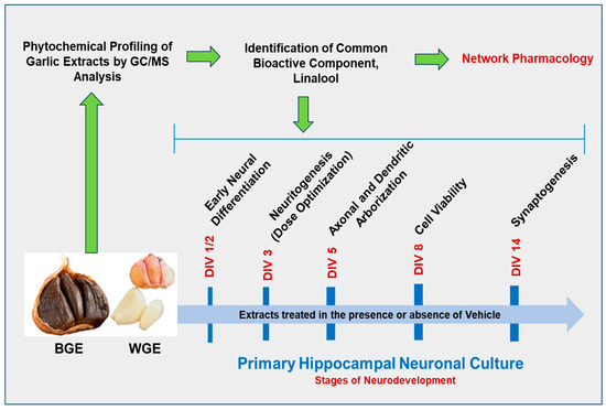 Neurodegenerative diseases (NDDs) are characterized by the dysregulation of neurogenesis, which in turn impacts neuronal differentiation, global or regional loss of neurons, and compromised neural network accompanying cognitive deficits [1,2]. Neurotrophic factors (NTF) that play a crucial role in promoting neuronal function, survival, and maturation are critical in the pathobiology of NDDs [3,4]. An insufficient level of various NTFs, including brain-derived neurotrophic factor has been reported in NDDs [5,6], thereby, NTFs or their mimetic are of therapeutic value. Evidence suggests that NTFs mimetic can stimulate neuritogenesis and help reconstruct compromised neuronal circuits [7], thus holding promise in the development of therapeutic agents for NDDs. Small molecule NTF mimetics have benefits over NTFs due to their accessibility to the blood–brain barrier [7]. As NTF mimetics, various medicinal herbs and their bioactive phytochemicals have emerged as a promising source of novel therapeutic agents for the treatment of neurodegenerative illnesses in recent years where the neurotrophic effects of these natural products have been linked to an increase in neuronal outgrowth [8,9,10,11]. Focusing on the neurotrophic effects of the bioactive components, the aim of this present study is to investigate the progression of neurons from the nascent neuronal differentiation stage to the synapse formation of the ethanol extract of unprocessed and processed A. sativum L.