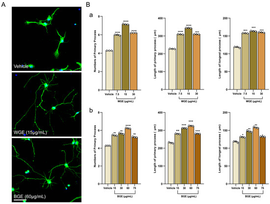 Hippocampal neurons of embryonic-19 (E19) rats were treated with WGE and BGE or a vehicle at varying doses. After 3 days, images of the neurons were obtained. The phase-contrast micrographs were used to investigate the morphology of 30 different neural cells on DIV3 (Days in vitro 3) for the dose optimization of BGE and WGE for neurite outgrowth activity (Figure 1). The typical fluorescence images of WGE and BGE-treated neurons were shown in Figure 2A, where both extracts promoted neuronal development dose-dependently (Figure S2, Supplementary File S1). The results demonstrated that neurite outgrowth parameters such as total neurites numbers and length, and the length of the longest process were significantly increased in both WGE (Figure 2(Ba)) and BGE (Figure 2(Bb))-treated neurons compared to control at a concentration of 15 and 60 μg/mL, respectively. Based on these findings, these optimal concentrations were chosen for further experiments. In addition, we compared the neuritogenic activity of BGE and WGE to that of other known neuromodulatory substances (positive control) such as puerarin (PE) and scoparone. Neurons were fixed at DIV3 and immune-stained for α-tubulin to observe hippocampal neuron morphologies (Figure S3A, Supplementary File S1). It was found that both PE and scoparone promoted the growth of neurites such as the number and length of the total primary neurites as well as the longest length of the primary neurite, although not as much as BGE and WGE (Figure S3B, Supplementary File S1).