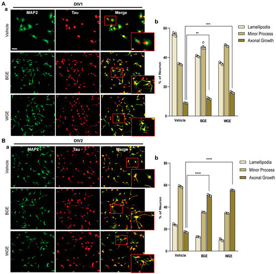 We observed the effect of BGE and WGE on neuronal polarity at the very early developmental stage (Figure 1). Staining with anti-MAP2 (green) as a somatodendritic marker and anti-Tau (red) as an axonal marker was carried out to differentiate various phases of early neuronal development of WGE and BGE-treated hippocampal cultures compared with vehicle (Figure 3(Aa,Ba)). Cultures treated with WGE and BGE showed approximately 15% and 10% more cells, respectively, showing the extension of axons, in the developmental stage 3 category than the vehicle-treated neuron at 24 h (DIV1) (Figure 3(Ab)). At 48 h (DIV2), axonal elongation of WGE and BGE-treated neurons at stage 3 was observed in around 55% and 50%, respectively, of total neurons, whereas only 16% of total neurons treated with vehicle reached stage 3 (Figure 3(Bb)). These findings suggest that WGE and BGE improved neural differentiation, while WGE impact is more pronounced.