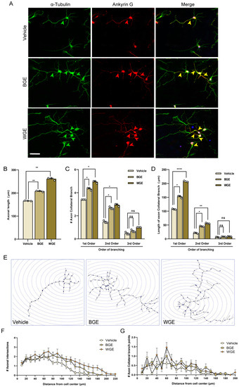 Next, we investigated the effect of BGE and WGE on the development of axonal sprouting. We used a morphometric study to determine whether WGE and BGE have an impact on axonal maturation. Within five days of treatment with both extracts, neurons had undergone enormous axonal growth. Immuno-staining with ankyrin G was used to differentiate axons from dendrites (Figure 4A). The axonal length of cells treated with BGE and WGE was found to increase significantly over time, by 31.25% and 56.25% relative to control (Figure 4B). More complex axon collateral branches were observed in hippocampal neurons grown in WGE-treated cultures compared to vehicle controls. The numbers of primary and secondary branches of WGE-treated neurons were increased by 51.51% and 87.5% over the control (Figure 4C). The primary and secondary collateral branches in BGE and WGE-treated neurons increased 2-fold and 2.5-fold longer compared to the control (Figure 4D). However, the number of tertiary branches was found to rise dramatically after WGE treatment, but the other parameter (length) remained unaffected (Figure 4C,D).