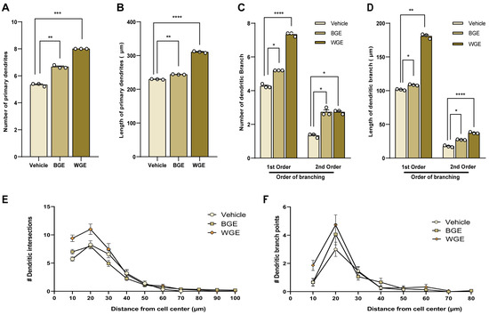 Effect of BGE and WGE on dendritic maturation. The microscopy images that are representative of dendritic morphogenesis are identical to those shown in Figure 4A. (A) Morphometric analysis shows statistically significant in the number of primary dendrites, (B) the total length of primary dendrites, (C) the number, and (D) the total length of dendritic branches. (E) Sholl analysis for dendritic intersection points and (F) dendritic branching points. Statistics show as mean ± standard error of the mean (S.E.M.) of three separate experiments (n = 3, each includes 10 neurons, Student’s t-tests, * p < 0.05, ** p < 0.01, *** p < 0.001, **** p < 0.0001) and numbers are indicated by # symbol.