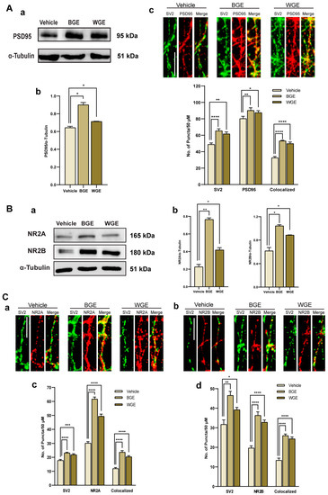 Effect of BGE and WGE on synaptic sprouting. (A) Immunoblotting analysis of neuronal lysates from DIV16 confirmed the presence of the proteins PSD95 compared with α-tubulin (a), and a comparison of mean intensity revealed a statistically significant difference in PSD95 expression between BGE and WGE-treated neurons (b), fluorescence images showing the pre-synapse and post-synapse puncta are indicated by co-staining with SV2 (green) and PSD95 (red), respectively. Co-localization (yellow puncta) indicates synapse formation; scale bar: 2 μm, and graph depicting the number of SV2, PSD95, and co-localized (synapse) puncta that are found per 50 μm segment in neurons that were either treated with or without WGE and BGE (c). (B) Immunoblotting analysis of neuronal lysates from DIV16 confirmed the presence of the proteins GluN2A (NR2A) and GluN2B (NR2B) compared with α-tubulin as a loading control (a), and a comparison of mean intensity revealed a statistically significant difference in NMDA receptor expression between BGE and WGE-treated neurons (b). (C) Fluorescence images showing the immune-staining of SV2 (green) with NR2A (red) (a), NR2B (red) (b), and co-localized (synapse) puncta that are found per 50 μm segment in neurons that were either treated with or without WGE and BGE, scale bar: 2 μm; the bar graph depicting the numbers of SV2, NR2A puncta (c), SV2, NR2B puncta, (d) and co-localized (synapse) puncta that are found per 50 μm segment in neurons that were either treated with or without WGE and BGE. Statistics show as mean ± standard error of the mean (S.E.M.) of three separate experiments (n = 3, each includes 10 neurons, Student’s t-tests, * p < 0.05, ** p < 0.01, *** p < 0.001, **** p < 0.0001).