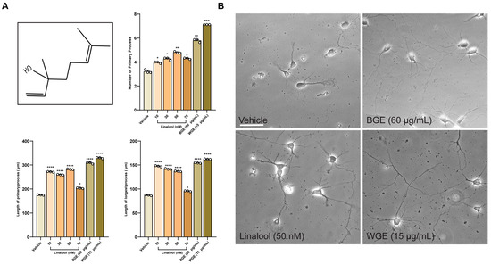 Linalool treatment (10–70 nM) resulted in significantly longer neurites on average with a higher number of primary neurites as compared to vehicle-treated neurons (Figure 7A,B), indicating that linalool might contribute, at least in part, to the neurite outgrowth activity of garlic extracts. Nonetheless, the impact was significantly lower than BGE and WGE garlic, suggesting that some other phytochemicals might also play an important role.
