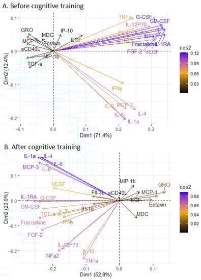 PCA of all blood immune parameters of MCI patients before and after cognitive training. (A) Biplots of the variables for the immune parameters before the cognitive training. (B) Biplots of the variables for the immune parameters after the cognitive training; Dim1: component 1; Dim2: component 2; cos2: the degree of the variable representation in each component. The ratio of cos2 changes is indicated by colored arrows. High cos2 values are colored blue and low cos2 values are colored black. Intermediate values are represented by a spectrum from violet (0.08) to brown (0.02) (from higher values to lower values, respectively).