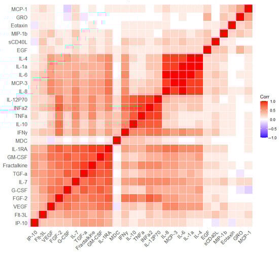 Correlation analysis of differences in immune parameter concentrations between the first and second visits in MCI patients. Corr–Pearson correlation coefficient. Each cell represents a level of correlation between two serum biomarkers (horizontally and vertically, respectively). The Corr value is indicated in color. High Corr values are colored in red (positive correlation) and low Corr values are colored in blue (negative correlation). Intermediate values are represented by a spectrum from red to blue.