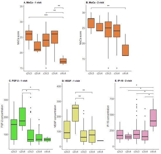 Cognitive scale parameters and concentration of immune biomarkers in the blood of patients with different APOE variants. (A) MoCA scale scores on the first visit; (B) MoCA scale scores on the second visit; (C) FGF-2 concentration on the first visit; (D) VEGF concentration on the first visit; and (E) IP-10 concentration on the second visit. *—p < 0.05; **—p < 0.01; ***—p < 0.001.