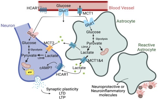 Abnormal metabolism, such as mitochondrial dysfunction and defective glucose metabolism and/or neuronal glucose uptake, is commonly found in neurodegenerative diseases, such as Alzheimer disease (AD), Parkinson disease (PD), amyotrophic lateral sclerosis (ALS), and Huntington disease (HD) [,]. Reactive astrocytes are associated with neurodegenerative diseases, such as AD and PD, and can secrete molecules into the extracellular space that can have neuroprotective or neurodegenerative functions []. Specifically in AD, which is characterized by amyloid beta plaques and neurofibrillary tangles, glucose uptake is decreased while increased levels of lactate are found in the cerebrospinal fluid (CSF) [,], which is thought to be due to pro-inflammatory microglia [,]. Interestingly, in the 3xTg AD mouse model, astrocytic lactate production through aerobic glycolysis was decreased []. Like AD patients, PD patients, who have severe dopaminergic loss, have elevated CSF lactate levels [,]. While in the MPTP-induced mouse model of PD, researchers found upregulated hexokinase 2 increased lactate, which prompted the degeneration of dopaminergic neurons []. Further studies are urgently needed as lactate levels are clearly altered, though there are differing results across studies, as lactate can be used as a biomarker to clinically diagnose patients with neurodegenerative diseases by measuring CSF levels.