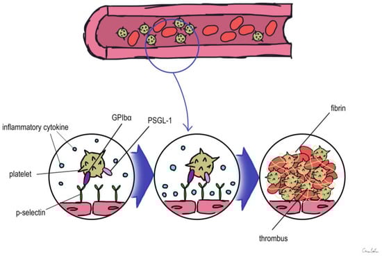 P-selectin, which is stored in the granule membrane of resting platelets (a-granules) and endothelial cells (Weibel–Palade bodies) [], is a member of the selectin family of cell adhesion molecules together with E-selectin and L-selectin []. The primary ligand for P-selectin in vivo is P-selectin glycoprotein ligand 1 (PSGL-1), which is expressed in the majority of leukocytes and is also present in trace levels on platelets []. Transmembrane P-selectin is redistributed onto the cell surface after cell activation and partially discharged into the bloodstream in its soluble form (sP-selectin) []. It facilitates the interaction of leukocytes that express PSGL-1 with activated platelets and endothelial cells [,,]. In humans, elevated levels of soluble P-sel (sP-sel) are typical in DVT and VTE []. The interaction between P-selectin and PSGL-1 is crucial for thrombus development [,,]. P-selectin was shown to have an impact on fibrin deposition in the thrombus by Palabrica et al. []. They discovered that inhibiting P-selectin interactions selectively prevented fibrin from being deposited on a thrombogenic graft in a baby as well as leukocyte adherence to platelets [].