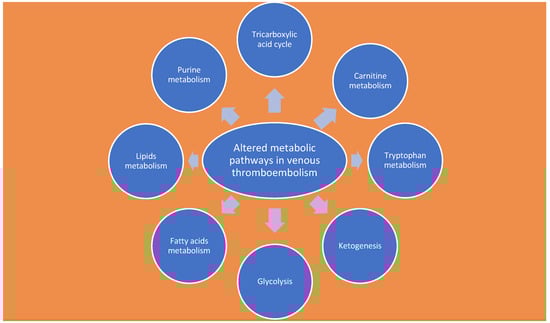 VTE cases were associated with reduced levels of carnitine, overregulated aromatic amino acids, 3-hydroxybutyrate, BCAAs, and lipids in the plasma, serum, thrombus, and vein wall; dysfunction of the kynurenine and tricarboxylic acid pathways have been reported [].