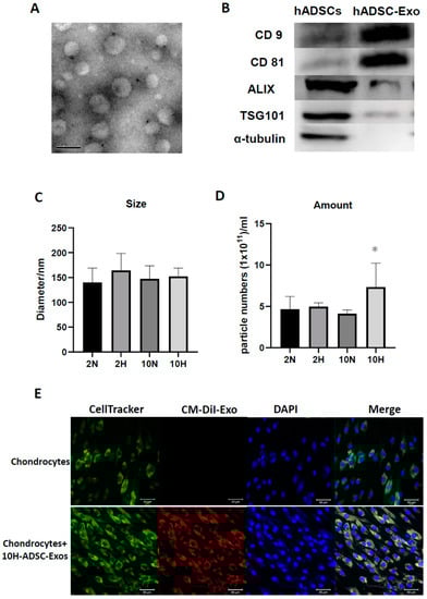 Exosomes induced by normoxia/hypoxia and normal/low serum culture conditions in cultured ADSCs. (A) Transmission electron microscopy (TEM) image of ADSC-Exos (scale bar: 50 nm). (B) Western blot analysis of the protein levels of ADSC-Exo markers in ADSCs and ADSC-Exos was performed, including CD9, CD63, CD81, ALIX, TSG101, and α-tubulin levels, which were used as negative controls. (C) Nanoparticle tracking analysis (NTA) evaluating the ADSC-Exo size and (D) concentration after four conditions induced ADSCs, including 20% O2 (normaxia) + 2% de-Exo-FBS, (2 N), 1% O2 (hypoxia) + 2% de-Exo-FBS (2H), 20% O2 (normaxia) + 10% de-Exo-FBS (10 N), and 1% O2 (hypoxia) + 10% de-Exo-FBS (10H) for 2 days. Data represent the mean exosome size, and each column represents the mean ± SEM of six replicate cultures. *, p < 0.05 compared to 2 N induction. (E) 10H-ADSC-Exo uptake by HACs. The CM-DiI-labeled exosomes (red fluorescence-stained) were taken up by cell tracker-labeled chondrocytes (green fluorescence-stained; DAPI-stained nucleus: blue fluorescence) on Day 12.