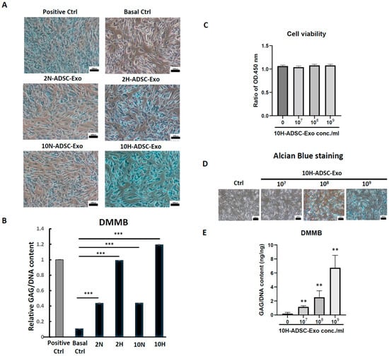 We compared different culture conditions and found the optimal function of exosomes derived from ADSCs on chondrocytes. (A) Alcian blue staining and (B) DMMB assay analysis of GAG synthesis in HACs treated with normal culture medium (as a positive control), basal medium (only DMEM), and 4-condition-induced ADSC-Exos (2 N, 2H, 10 N, 10H) supplemented in basal medium. Data represent the relative GAG/DNA content, and each column represents the mean ± SEM of six replicate cultures. ***, p < 0.001 compared to the basal control culture. (C) MTS assay evaluating chondrocyte viability after treatment with 10H-ADSC-Exos (107~109 particles/mL) for 5 days. Data represent the relative cell viability, and each column represents the mean ± SEM of six replicate cultures. There was no difference compared with the basal control culture (Ctrl). (D) GAG synthesis of HACs treated with different doses of 10H-ADSC-Exos (107~109 particles/mL) by Alcian blue staining and (E) DMMB assay. Data represent the relative GAG/DNA content, and each column represents the mean ± SEM of six replicate cultures. **, p < 0.01, compared to the basal control culture.