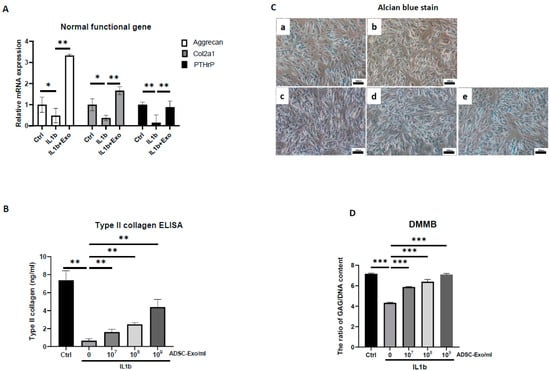 Hypoxia-induced ADSC-Exos enhanced cartilaginous matrix synthesis in IL-1β-induced OA-like inflammaging articular chondrocytes. (A) The mRNA expression of the normal functional genes aggrecan, col2a1, and PTHrP in vitro in HACs treated with IL1-β with or without ADSC-Exos (109 particles/mL) for 12 days. The mRNA expression of GAPDH in HACs was used as the internal control. (B) Type II collagen ELISA was performed to quantify the protein level when HACs were treated with IL1-β and with or without ADSC-Exos (107~109 particles/mL) for 12 days. (C) Alcian blue staining ((a) Ctrl, (b) IL-1β, (c) IL-1β+ADSC-Exo 107 particles/mL, (d) IL-1β+ADSC-Exo 108 particles/mL, (e) IL-1β+ADSC-Exo (109 particles/mL) and (D) DMMB assay analysis of GAG synthesis in HACs treated with IL1-β and with or without ADSC-Exo (107~109 particles/mL) for 12 days. Each column represents the mean ± SEM of six replicate cultures. Data from each group were compared with those of the IL-1β only group, *, p < 0.05, **, p < 0.01, ***, p < 0.001.