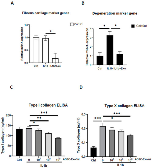 Hypoxia-induced ADSC-Exos inhibited fibrous and degenerated cartilage in IL-1β-induced OA-like articular chondrocytes. (A) Fibrous cartilage genes, col1a1, and (B) degeneration marker gene, col10a1, mRNA expression in vitro in HACs treated with IL1-β and with or without ADSC-Exos (109 particles/mL) for 12 days. GAPDH mRNA was used as the internal control. (C) Type I and (D) type X collagen ELISAs were performed to quantify the protein levels when HACs were treated with IL1-β and with or without ADSC-Exos (107~109 particles/mL) for 12 days. Each column represents the mean ± SEM of six replicate cultures. Data from each group were compared with those of the IL-1β only group, *, p < 0.05; **, p < 0.01; ***, p < 0.001.