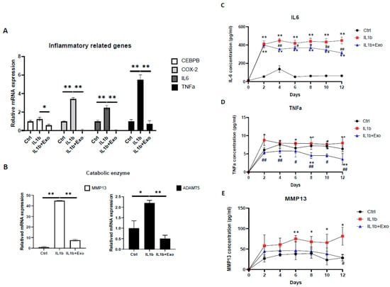Hypoxia-induced ADSC-Exos suppressed inflammatory cytokines and degradation enzymes in inflammaging articular chondrocytes. (A). Inflammatory-related gene (CEBPβ, COX-2, IL-6, and TNF-α) and (B) catabolic gene (MMP13 and ADAMT5) mRNA expression in HACs treated with IL1-β with or without ADSC-Exos (109 particles/mL) for 12 days in vitro. GAPDH mRNA expression was used as the internal control. Data from each group were compared with those of the IL-1β only group, *, p < 0.05; **, p < 0.01. (C) IL-6, (D), TNF-α, (E), and MMP13 ELISAs were performed to quantify the protein levels when HACs were treated with IL1-β with or without ADSC-Exos (109 particles/mL) for 12 days. Each column or scatter plot represents the mean ± SEM of six replicate cultures. Data from each group were compared with those of the control group, *, p < 0.05; **, p < 0.01 and were compared with those of the IL-1β group, #, p < 0.05; ##, p < 0.01.
