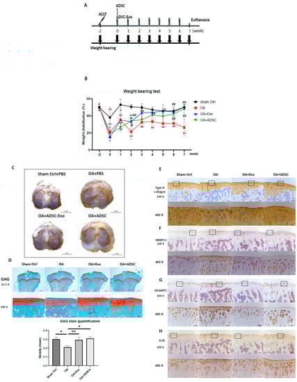 The animal experiments were approved by the Animal Care and Use Committee of Kaohsiung Medical University (IACUC number 109242). Thirty 8-week-old male Sprague-Dawley rats were purchased from BioLASCO Taiwan and housed under standard laboratory conditions (24 °C, 12 h light-dark cycle) with food and water ad libitum. An anterior cruciate ligament transection (ACLT) model was induced as previously described [59]. Briefly, rats were randomly and evenly assigned into four groups by body weight. The experimental design has four groups, with 7–8 animals in each group: the sham operation as Sham control group (intra-articular (IA) injection PBS (40 µL) per week, n = 7), the OA+PBS group (IA injection PBS (40 µL) per week, n = 7), the OA+Exo (IA injection ADSC-Exo 7.5 × 109 particles/mL in PBS (40 µL) per week, n = 8), and the OA+ADSCs (IA injection 1 × 106 ADSCs in PBS (40 µL) only in the first week, n = 8 group). Each rat was anesthetized with zoletil:rompun = 4:1, and after being shaved, the right knee joint was exposed through a medial parapatellar approach, and the left knee was used as the contralateral control. The patella was dislocated laterally, and the knee was placed in full flexion, followed by ACL transection with microscissors. After surgery, the joint capsule and skin were sutured using Vicryl 4-0 (UNIK, New Taipei City, Taiwan) nonabsorbable sutures. In sham-operated animals, wounds were closed after subluxation of the patella. All groups could move freely in plastic cages until they were euthanized by CO2 gas overdose inhalation at 7 weeks post-surgery.