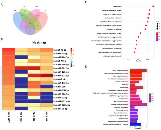 Next generation sequencing (NGS) and bioinformatic analysis of miRNA profiles in 4 culture conditions induced by ADSC-Exos. (A) Comparison and intersection of miRNAs from 4 culture conditions induced ADSC−Exos (2H, 2N, 10H, 10N group). (B) Heatmap of the differentially expressed miRNAs from 4 groups. Hierarchically represented the miRNAs from the 10N group and compared them with the other groups (p value < 0.05 and fold change > 2). (C) GO and (D) KEGG pathway analyses. There were 3358 target genes of 7 selected miRNAs in ADSC-Exos.