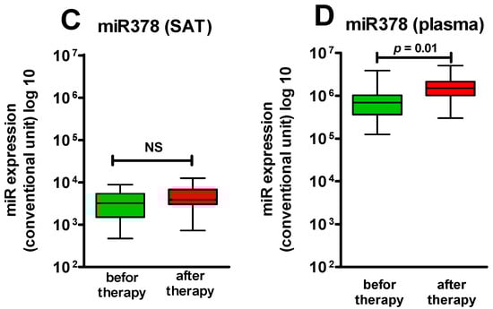 9]. Moreover, the significance of the AT contribution to the circulatory profile of miRs, in our opinion, should be evaluated on a case-by-case basis, especially for those miRs that are also highly expressed in other tissues. This characterization applies in particular to miR-378 and miR-142. To determine whether the circulating levels of these miRs reflect changes in their expression in SAT, we performed a parallel evaluation of miR-378 and miR-142 expression in SAT and their levels in plasma, before and during sibutramine therapy.