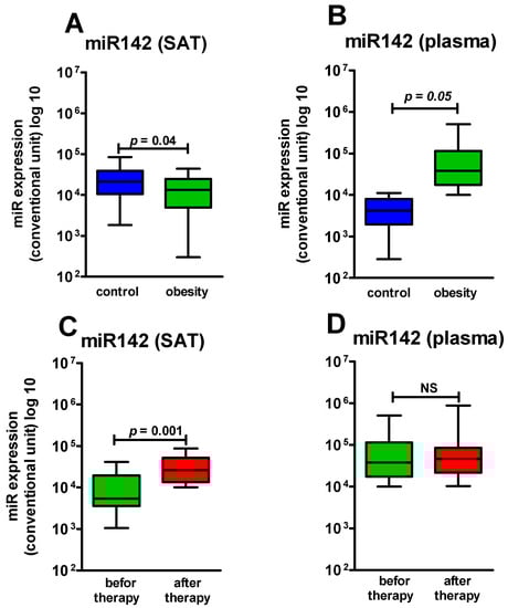 31], its expression was elevated, whereas low miR-142 expression was determined in lung tissue. In these studies, there is a clear analogy with our results, demonstrating decreased expression of miR-142 in SAT in obesity compared to healthy subjects and increased levels of miR-142 in plasma of obese patients.