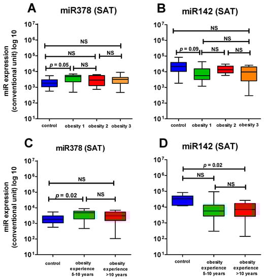 Considering this, the multidirectional character of the changes in the expression of these miRs, which is the most pronounced in the early stages of obesity, seems very logical. The most pronounced elevation in miR-378 expression and reduction in miR-142 expression exactly at the first stage of obesity can be explained by the fact that at the beginning of obesity there is a maximal activation of mechanisms ensuring the expansion of the SAT volume to store the excess incoming energy. Other researchers have also noted that miR-378 expression increases during normal adipogenesis in humans [