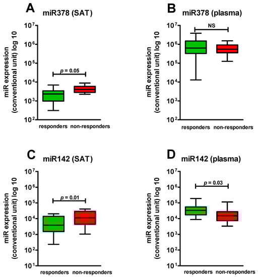 33] that included 17 studies evaluating the dynamics of miR expression before and after surgical treatment of obesity. Only three of these evaluated miR expression in SAT and not a single one showed a parallel evaluation. This meta-analysis reported that both miR-142 and miR-378 were noted to be differentially expressed in plasma of obese and normal-weight individuals. But, while the results for the direction of change of miR-142 were consistent in the studies presented [