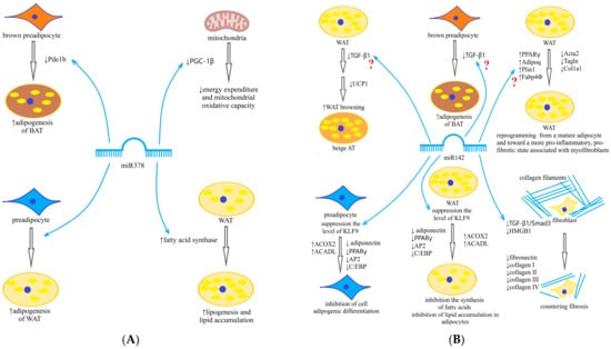 According to the literature, miR-378 and miR-142 have multidirectional effects on preadipocyte differentiation into adipocytes and adipogenesis of WAT. Increased expression of miR-378 stimulates differentiation of precursor cells into adipocytes and increases triglyceride deposition therein [