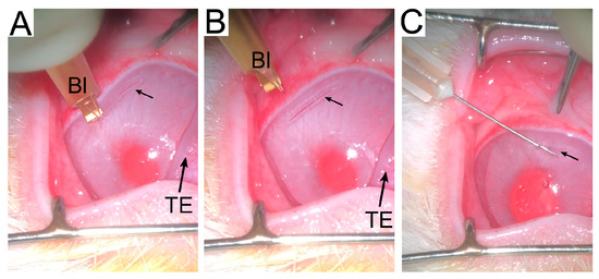 Procedures to create an incisional wound ((A–C) small arrows) and inject ACA (C). The blade (Bl) used to create the incisional wounds and the third eyelid (TE) are indicated.