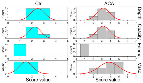 As indicated in Figure 2 and Table 2, the distributions of depth, opacity, and edema scores for the ACA and Ctr groups were similar. Regardless of insignificant differences, however, we observed that, except for edema, the scores for the Ctr group trended lower than the ACA group. In contrast, the distribution of the vascularization scores for the ACA (mean rank = 7.33) and Ctr (mean rank = 2.75) groups were significantly different (Figure 2).