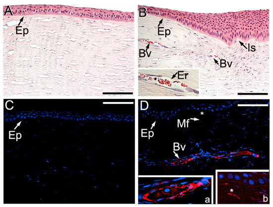 Representative images of the uninjured (A,C) and injured (B,D) cornea sites from the ACA group. Panels (A,B) show hematoxylin and eosin (H&E)-stained tissue samples. At the same time, (C,D) depict samples immunostained with the anti-αSMA antibodies (red) and nuclei (blue) stained with 4′,6-diamidino-2-phenylindole (DAPI). Epithelia (Ep) blood vessels (Bv), erythrocytes (Er), and the incision site (Is) are indicated. In panel (D), insert “a” shows a more detailed view of a blood vessel, and insert “b” depicts an αSMA-positive myofibroblast (Mf, asterisks). Bars = 50 μm. Note: the brightness in the entire insert “b” has been enhanced digitally to clearly outline the myofibroblasts.